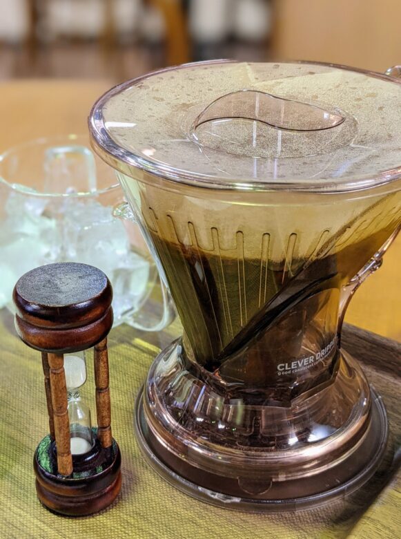 ドリップたけどお湯を溜めて蒸らすので、コーヒーの味がしっかりでます。一緒に渡される砂時計で3分待ちます。