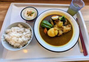 カレー、お味は良いです、値段はやや高く感じますが、骨付きチキン2つに野菜もあるのでこんなものでしょうか。