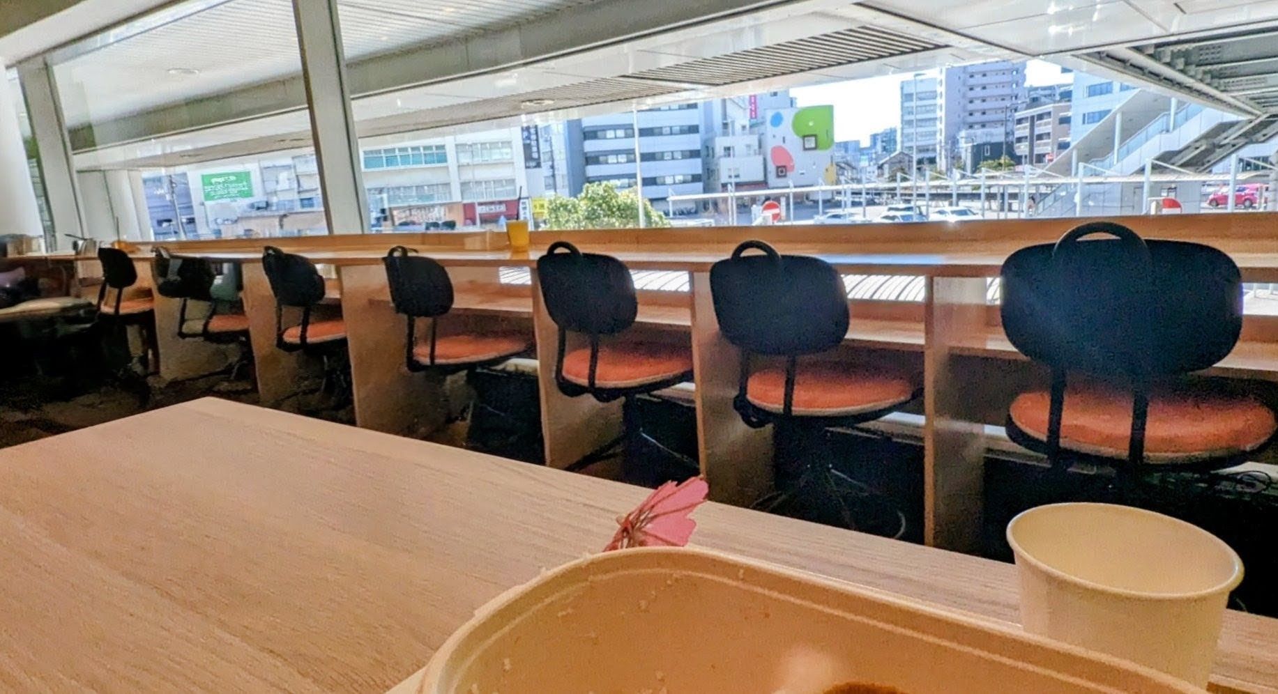 ロータリーを見下ろす開放的なカウンター席が並びます。基本、カウンターなので大人数には向きません、